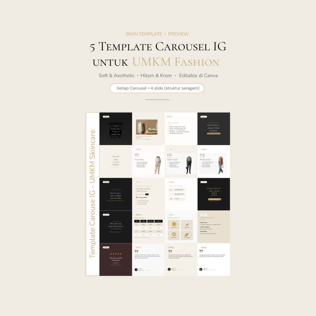 5 Template Carousel Instagram untuk UMKM Skincare adalah solusi lengkap untuk brand yang ingin tampil profesional, konsisten, dan efektif di Instagram. Dengan desain aesthetic, panduan lengkap, dan kemudahan edit, paket ini membantu UMKM fokus pada hal terpenting: membangun kepercayaan dan meningkatkan penjualan.